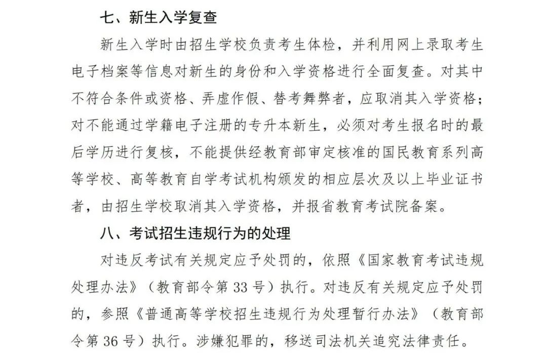 12.严查违规违纪行为。各地各高校要认真落实监管责任,及时调查处理成人高考中的违规违纪行为。对报名资格造假及违反考试有关规定的单位和个人,依据《国家教育考试违规处理办法》(教育部令第33号)等规定严肃处理。对违反招生有关规定的单位和个人,参照《普通高等学校招生违规行为处理暂行办法》(教育部令第36号)等规定严肃处理。涉嫌犯罪的,移送司法机关追究法律责任。对公职人员违规违纪的,要依规依纪严肃处理。对违反疫情防控规定造成疫情传播或者引发疫情传播风险的,要依法依规严肃处理。