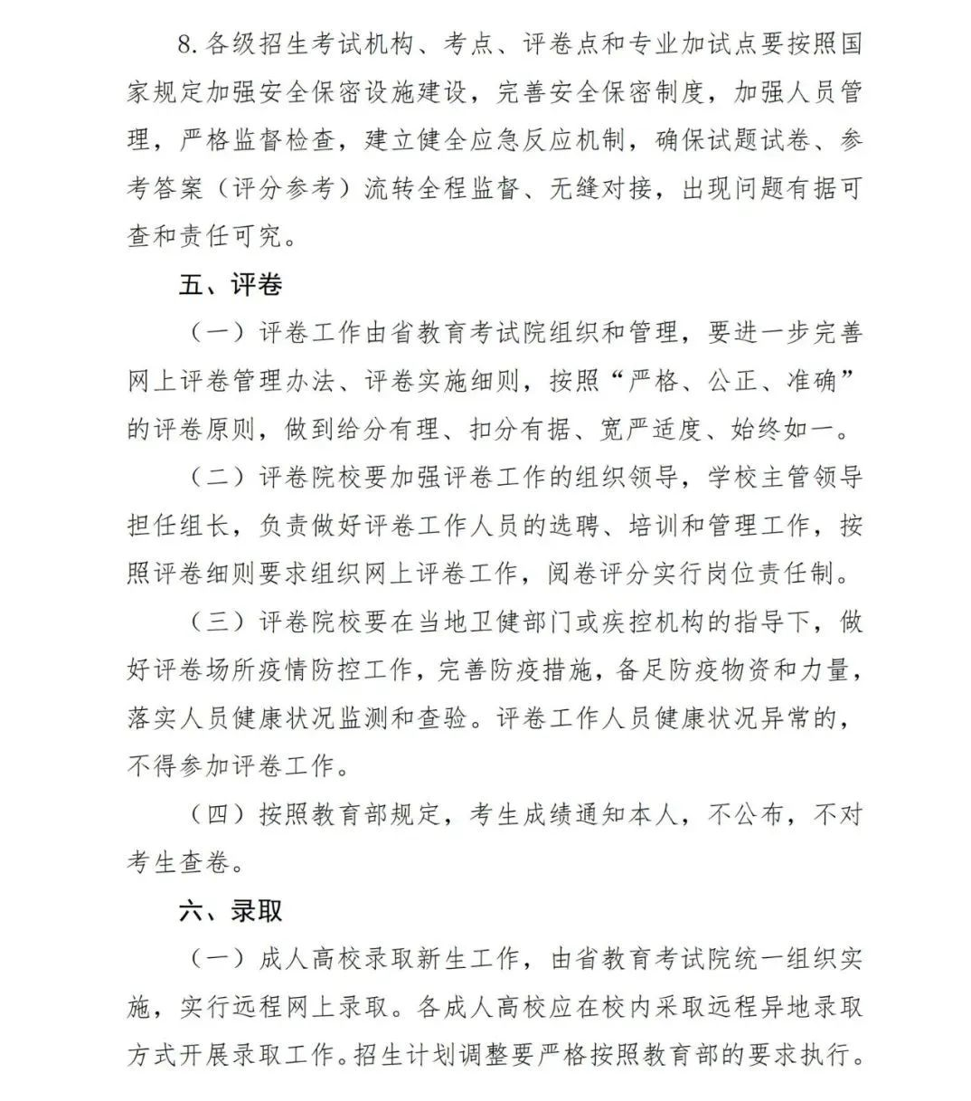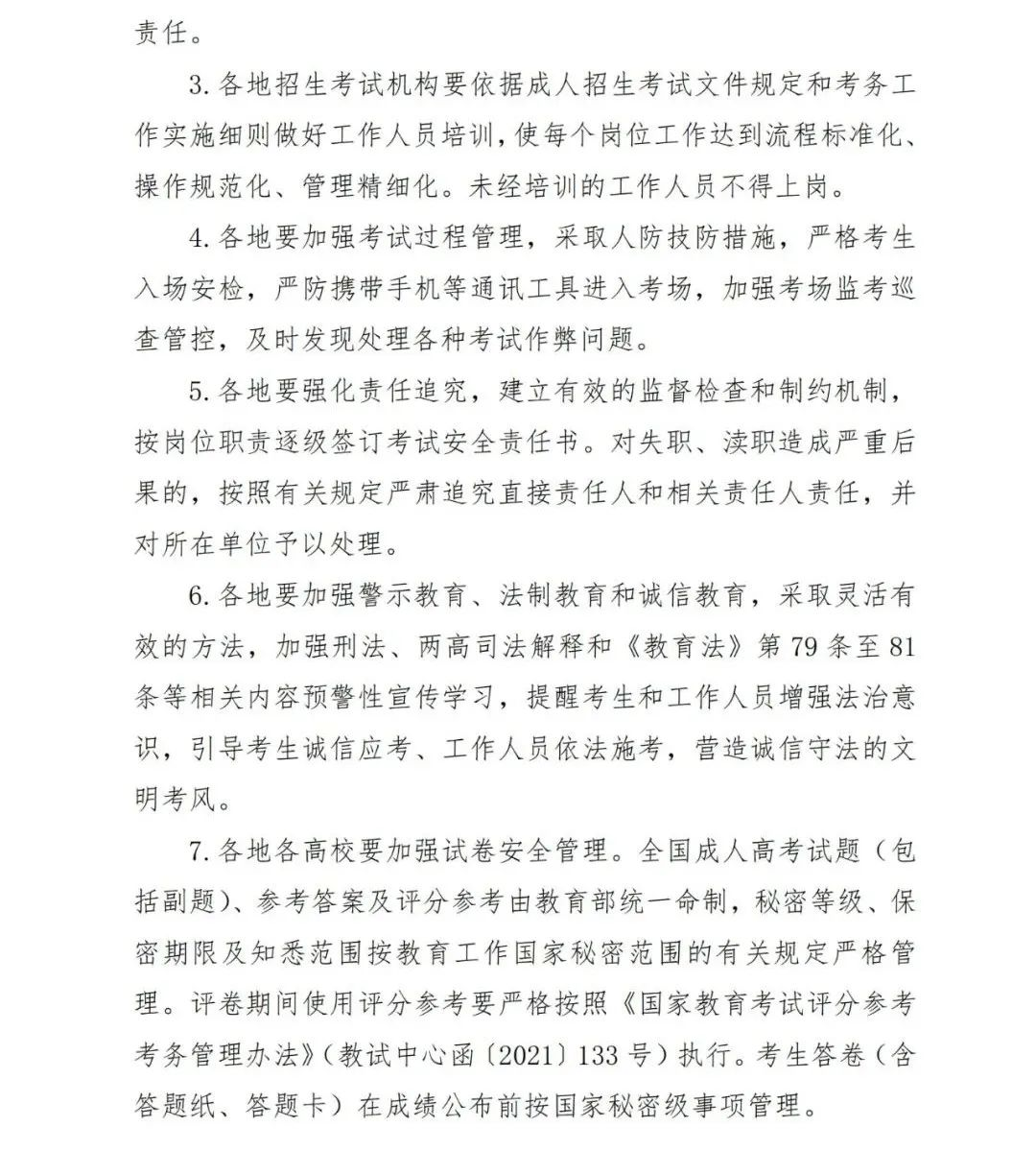 1.压实压细安全责任。各地要充分认识当前国家教育考试工作面临的严峻形势,高度重视考试安全和防疫安全,全力保障成人高考安全平稳实施。各级招生委员会是本行政区域内组织成人高考、治理考试环境、整治考风考纪、维护考试安全的责任主体,主要负责同志是第一责任人,各地教育行政部门分管负责同志和招生考试机构主要负责同志是直接责任人;高校是本校考试招生工作的责任主体,主要负责同志是第一责任人,分管负责同志是直接责任人。各地各高校要加强对成人高考工作的组织领导,层层落实考试安全防疫安全双重责任,确保责任落实到岗到人。要严格统一归口管理,各招委成员单位要在当地招委统一领导下,各司其职、密切配合、联防联控,遇到涉考重要问题和涉及考试新闻报道工作要及时上报当地招委归口处理,不得擅自向媒体发布涉考信息。要严格执行高校考试招生管理工作八项基本要求,重大问题决策要及时向当地党委、政府汇报,并报告省教育厅。各级各类学校都有责任承担国家教育考试工作任务,对需要作为考点、专业加试点和评卷点的,以及需要抽调教师负责监考、评卷等工作的,有关学校要合理调整教学安排,全力配合,不得推诿。