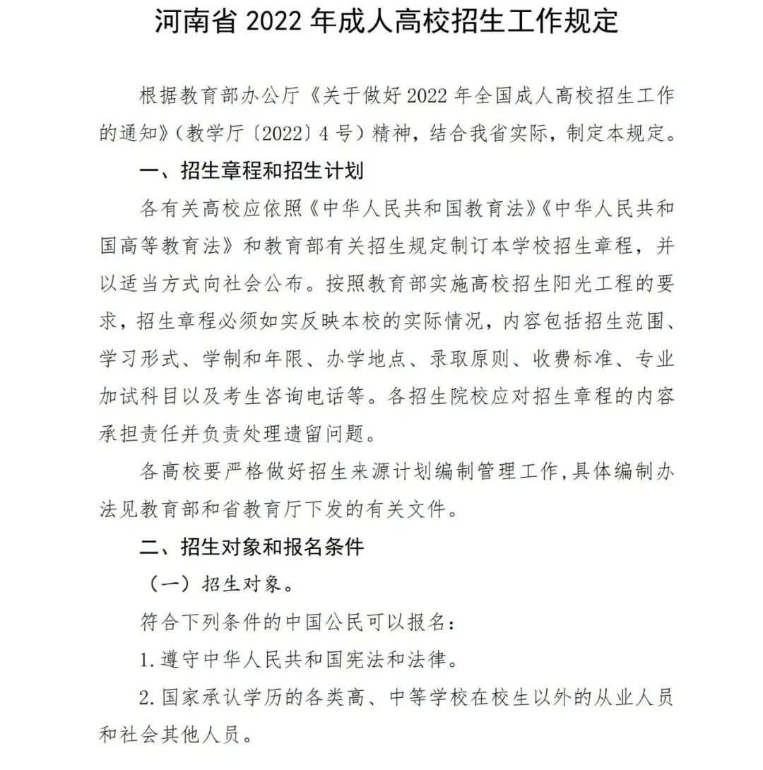近日,河南省教育厅印发《关于做好2022年成人高校招生工作的通知》,通知明确2022年成人高校招生统一考试将于11月5日和6日举行,9月14日开启报名。2022年成人高校招生(以下简称成人高考)工作以习近平新时代中国特色社会主义思想为指导,深入贯彻党的十九大和十九届历次全会精神,全面落实党的教育方针,坚持稳中求进工作总基调,强化组织领导,严格招生政策,规范考务管理,加强风险管控,确保考试招生安全有序、公平公正。为统筹做好考试招生和新冠肺炎疫情常态化防控工作,按照教育部办公厅《关于做好2022年全国成人高校招生工作的通知》(教学厅〔2022〕4号)要求,结合我省实际,现就有关事项要求通知如下:
