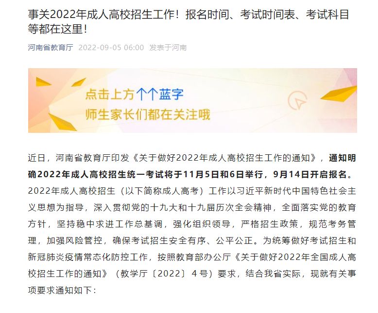 事关2022年成人高校招生工作!报名时间、考试时间表、考试科目等都在这里!
