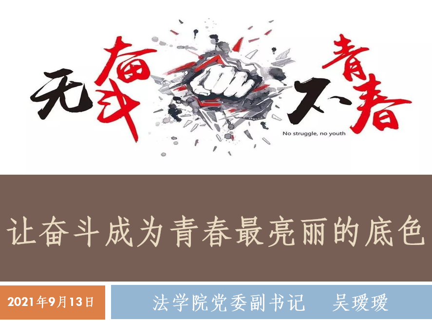 党委副书记吴瑷瑷以“让奋斗成为青春最亮丽的底色”为题,带领学生认真思考如何度过大学四年生活,引导新生顺利完成从高中生到大学生的角色转变,科学规划大学生活,树立正确的世界观、人生观、价值观。她激励同学们把握好人生学习的“黄金时段”,牢固坚定爱国价值观,牢固树立生命价值观,牢固培养学习价值观和劳动价值观,践行诚信价值观,争做新时代“五观”好青年。她激励2021级本科新生在大学阶段大胆去尝试努力,大胆去奋斗拼搏,用青春的斗志来实现个人理想,用集体的力量去成就中国梦想!