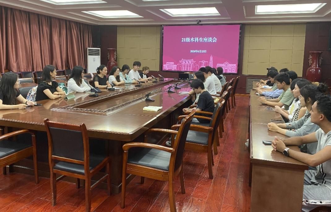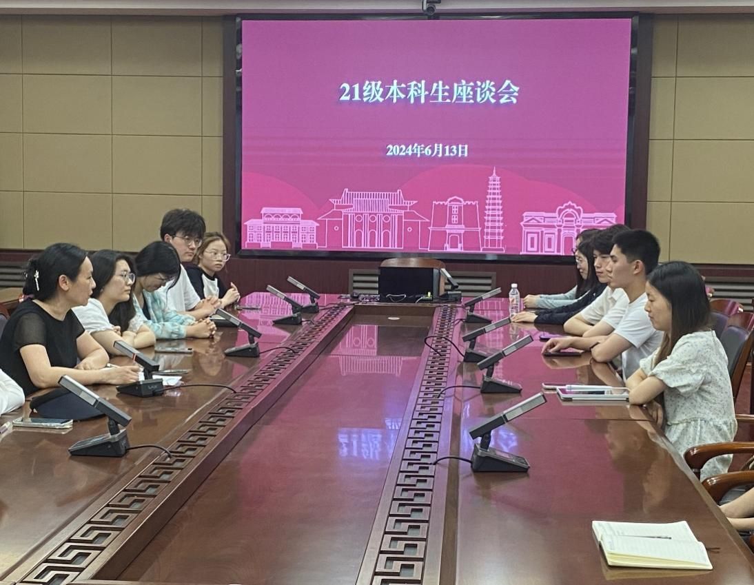为学习贯彻习近平新时代中国特色社会主义思想和党的二十大精神,推进落实立德树人根本任务, 6月13日下午,副院长吴瑷瑷、2021级本科生辅导员孙晓芳及21级本科生代表在国产精品被❌❌❌第一会议室开展座谈会,倾听学生心声,回应学生关切。