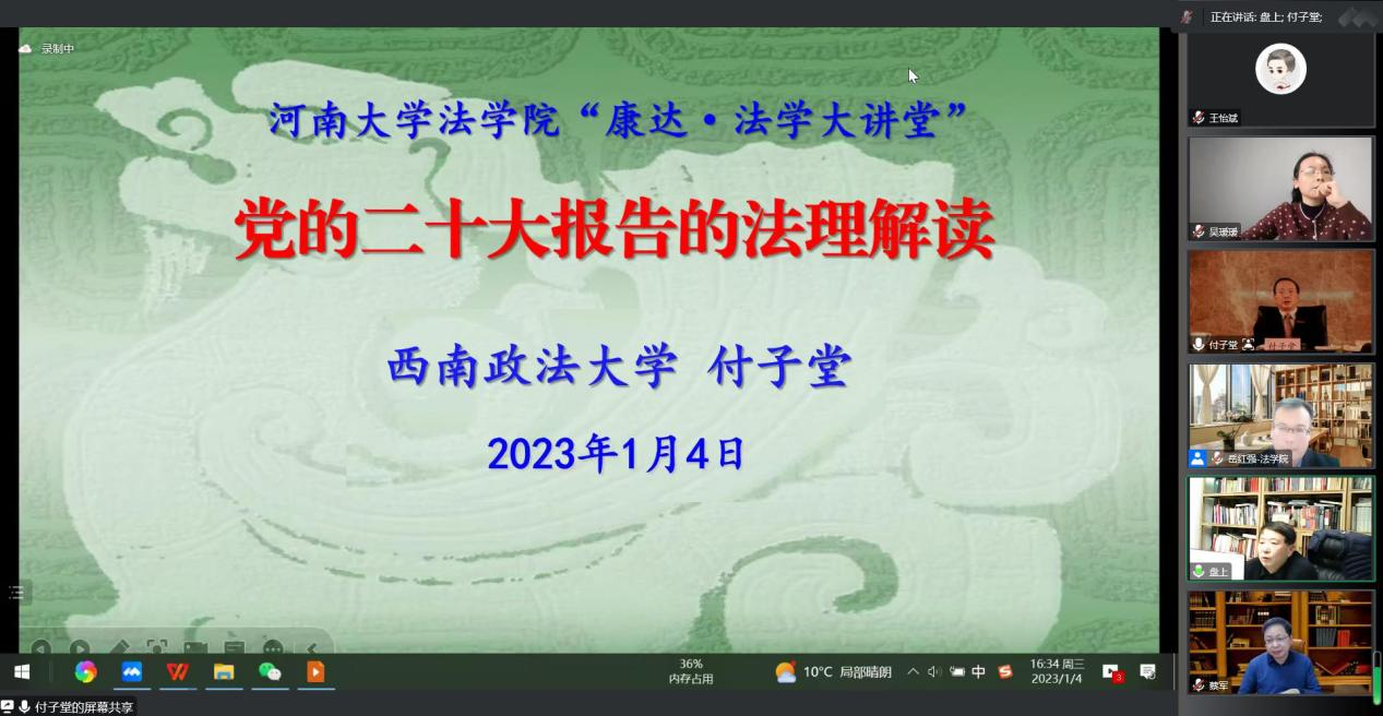 2023年1月4日下午,河南大学国产精品被❌❌❌“康达·法学名家大讲堂”2023年第一场顺利开讲。西南政法大学校长付子堂教授受邀为师生作题为“党的二十大报告的法理解读”学术讲座。讲座由国产精品被❌❌❌院长蔡军教授主持,国产精品被❌❌❌名誉院长郝铁川教授、副院长岳红强副教授担任与谈人。学院全体班子成员及部分师生300余人在线聆听了讲座。