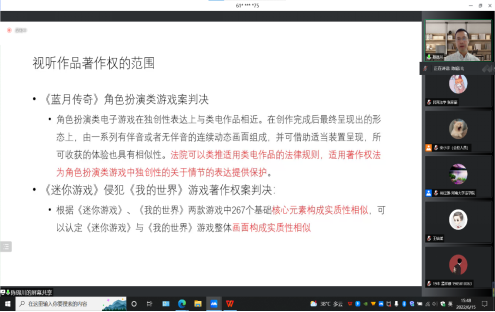 在讲座中,陈锦川法官主要围绕五个问题具体展开。第一,关于视听作品与电影作品和类似以摄制电影方法创作的作品的区别。陈锦川法官通过历史研究和比较法研究的方法展开论证,揭示出两者是可以互换的同义语,并非前者的范围较之后者更广。第二,由于体育赛事直播画面、网络游戏画面、短视频均符合电影类作品由一系列有伴音或者无伴音的画面组成的本质特征,因此三者属于视听作品。第三,关于音乐喷泉、灯光秀、烟花秀是否属于视听作品的问题。陈锦川法官主要阐释了核心要件之一“画面”在司法实践中如何判断。第四,关于视听作品著作权的范围。陈锦川法官指出不同类型作品以不同表达划分,作品的独创性体现在作品的表达中,由此来确定作品的保护范围。。第五,关于视听作品的构成要件或保护条件,其指出在判断某一客体是否属于著作权法保护的特定类型作品时,既要考虑客体是否符合作品的一般定义,也要考虑该作品是否符合法律对该特定类型作品所规定的条件。陈锦川法官结合自身丰富的审判经验,穿梭于理论与实践,通过深入浅出的讲解,使得大家对视听作品的问题理解更为深刻。