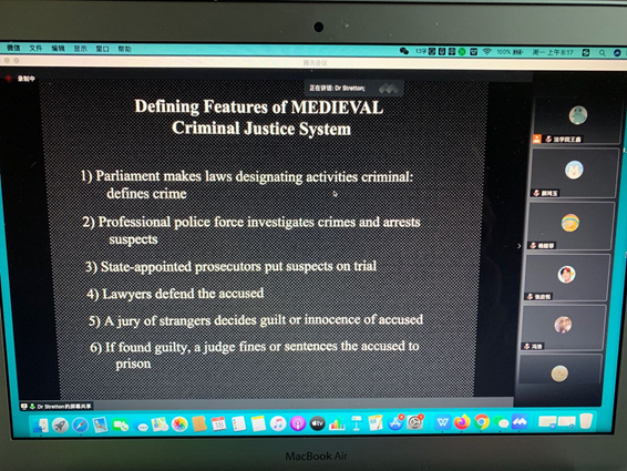 “英国犯罪与刑事司法史”课程由来自加拿大圣玛丽大学的Tim Stretton教授讲授,此系列课程将描绘从近代早期到近代的起诉和惩罚的演变,并将探讨英国社会性质的变化对于起诉和惩罚变化的影响,提高同学们的思辨能力。在1月18日的第一讲中,Tim教授从中世纪的历史背景引入,旁征博引,与同学们热情互动,拉近同学们与历史的距离,增强了同学们英国犯罪与刑事司法史的兴趣。程序法与实体法密切相关,在1月19日的第二讲中,Tim教授主要为同学们讲述了刑事诉讼制度的相关内容。