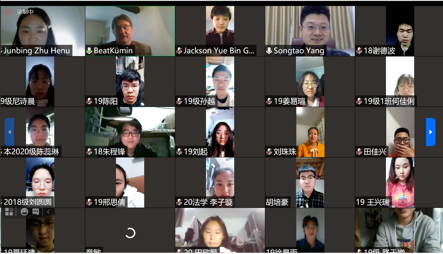 4月7日晚,英国华威大学Beat Kümin教授通过腾讯会议为我院师生做《近代早期欧洲的国家、法律与饮酒文化》的讲座。本次讲座由我院杨松涛副教授主持,加拿大多伦多大学博士候选人郭跃斌先生、我校经济学院朱俊兵老师作为特邀嘉宾参与点评。线上有300多名师生聆听了此次讲座。