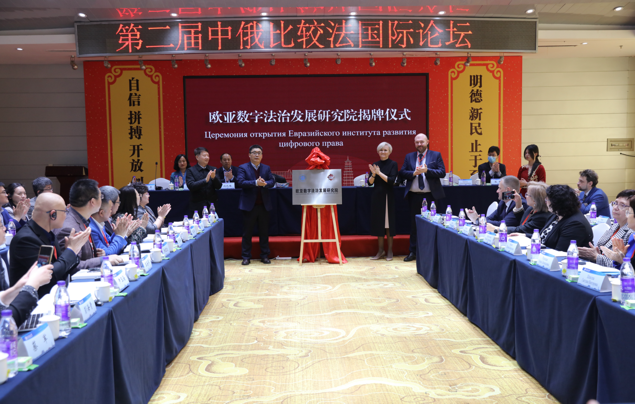 张向东、马若琳娜、郝铁川与莫斯科国立法律大学明巴列耶夫教授共同为我校与莫斯科国立法律大学共建的欧亚数字法治研究院揭牌。