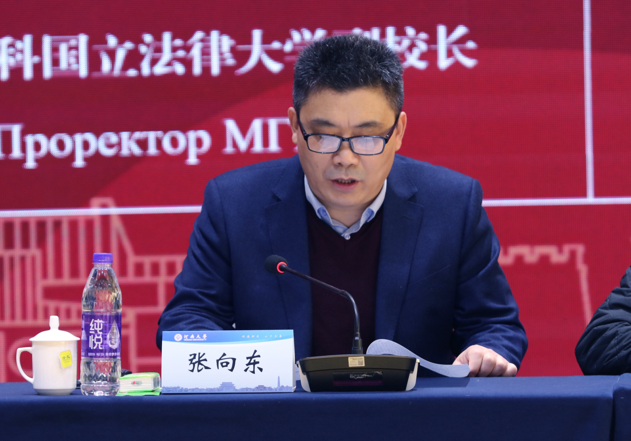 张向东代表学校向研讨会的召开表示热烈祝贺。他指出,长期以来,河南大学与俄罗斯高校保持了非常密切的合作关系,取得了丰硕成果。在共建“一带一路”与俄罗斯欧亚经济联盟建设战略对接的背景下,中俄法学界、教育界交流与合作的意义尤为重大。河南大学将以本届论坛为契机,积极顺应中俄双方构建全方位、深层次、多领域互利合作新格局的大趋势,共同传递中俄世代友好的接力棒,进一步凝聚法治共识、增进法治互信、深化法治合作,为高质量共建“一带一路”贡献法治力量。