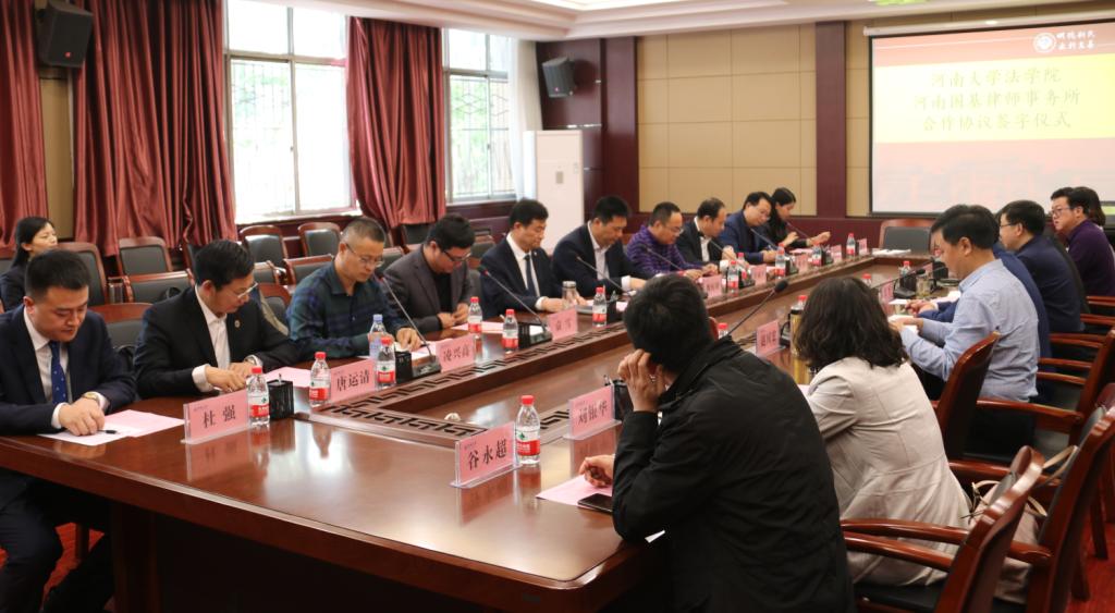 为加强高校与实务部门的合作,探索联合培养卓越法治人才、合作研究、社会服务新机制,4月17日下午,我院与河南国基律师事务所举行座谈并签署合作协议。国基律师事务所主任李晴川以及该所各分部主任一行10人,河南大学法制办公室主任刘银华,我院党委书记王桂,院长蔡军,副院长郑金玉、赵树宏、李亮等出席了签约仪式。