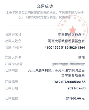 7月30日,河南大学上海校友会法学分会49位校友主动伸出援助之手,向国产精品被❌❌❌受灾同学们捐款24866.66元,表达对受灾同学的关切关爱,帮助其渡过难关。